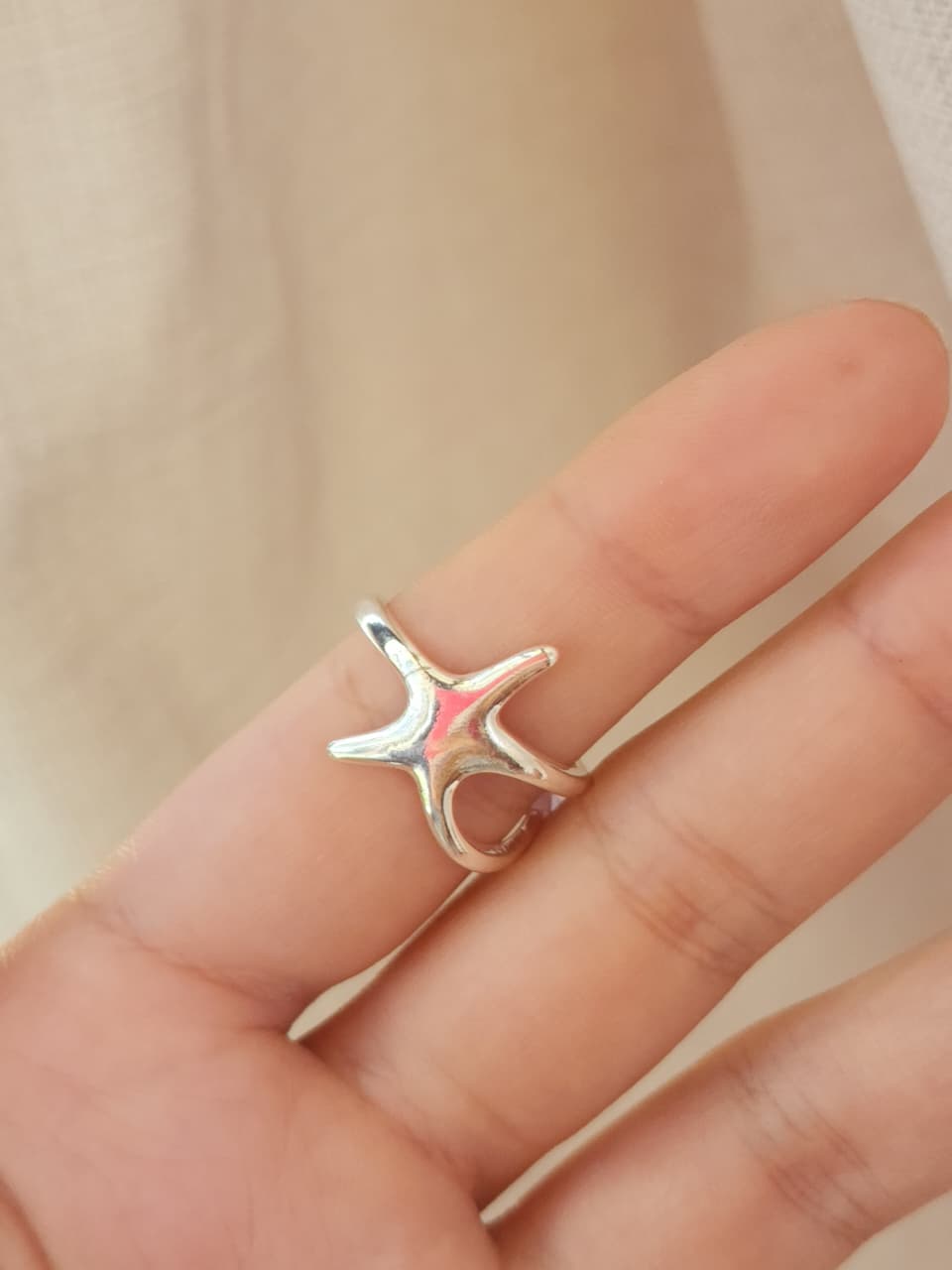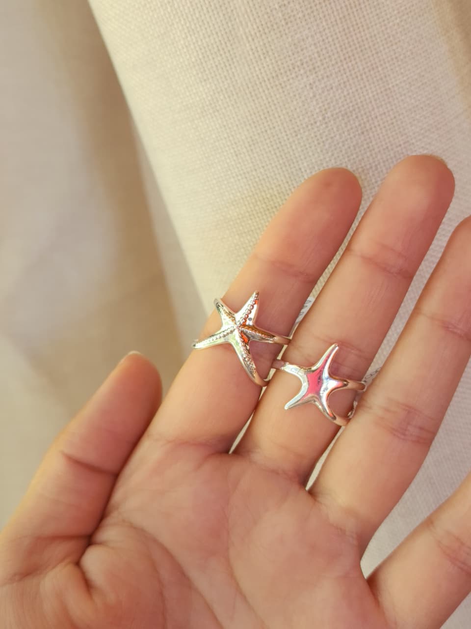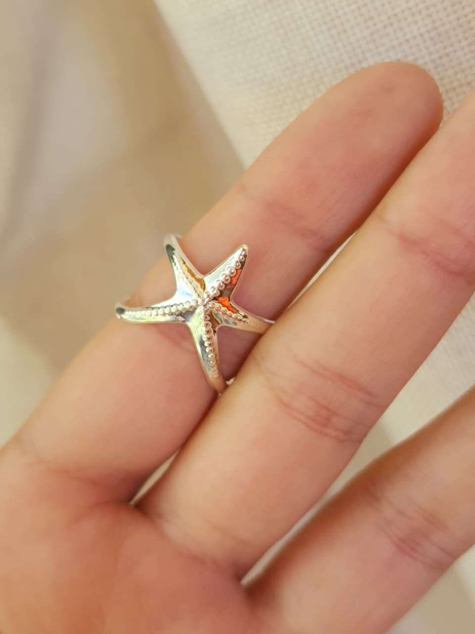 Anillo acero blanco, estrella de mar lisa y labrada.