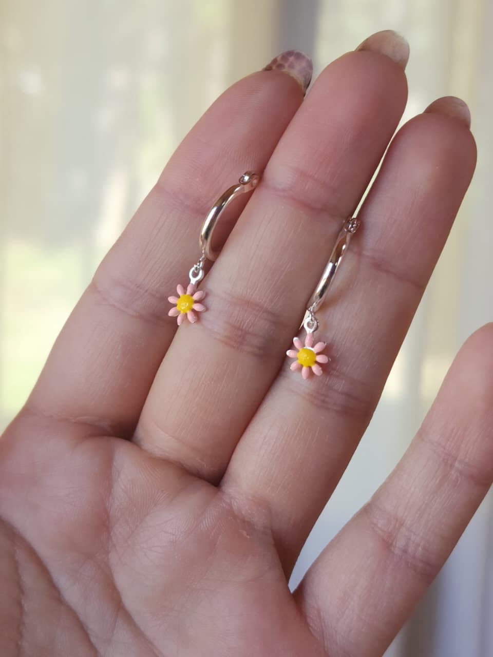 Aros argolla acero blanco, dije margarita rosa.