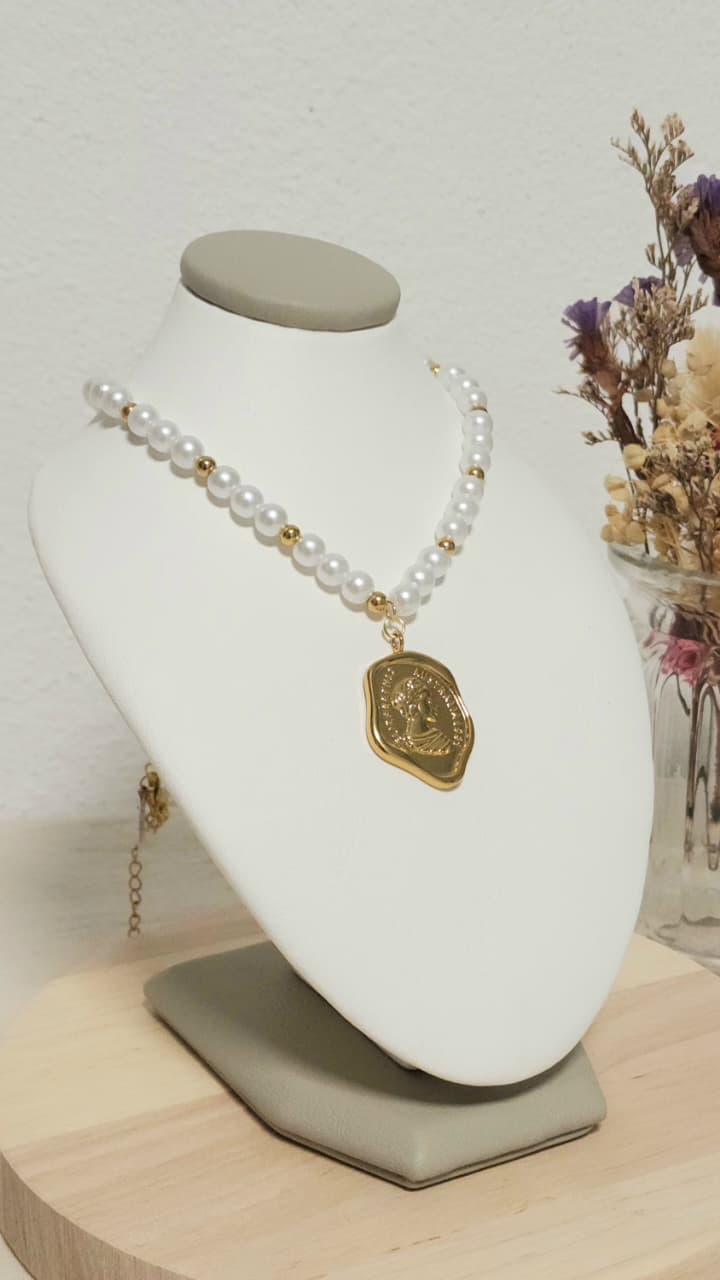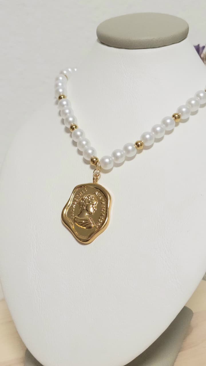 Collar acero dorado, con perlas, con medalla reina Elizabeth.