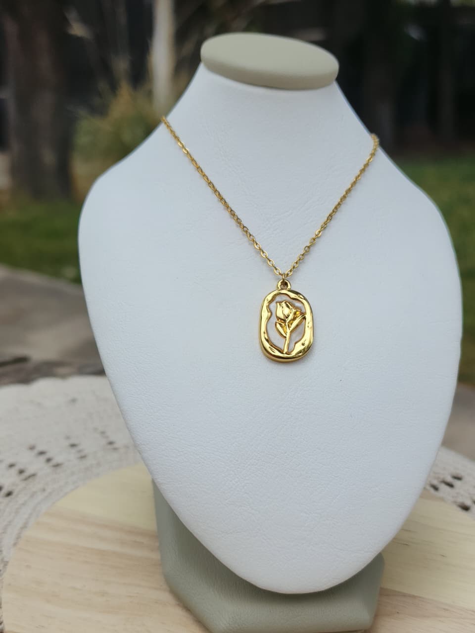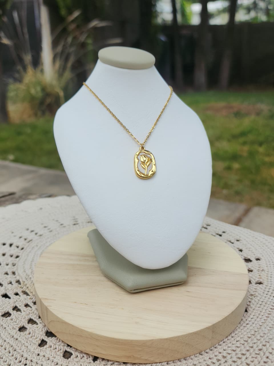 Collar acero dorado, con medalla simil nacar con rosa.