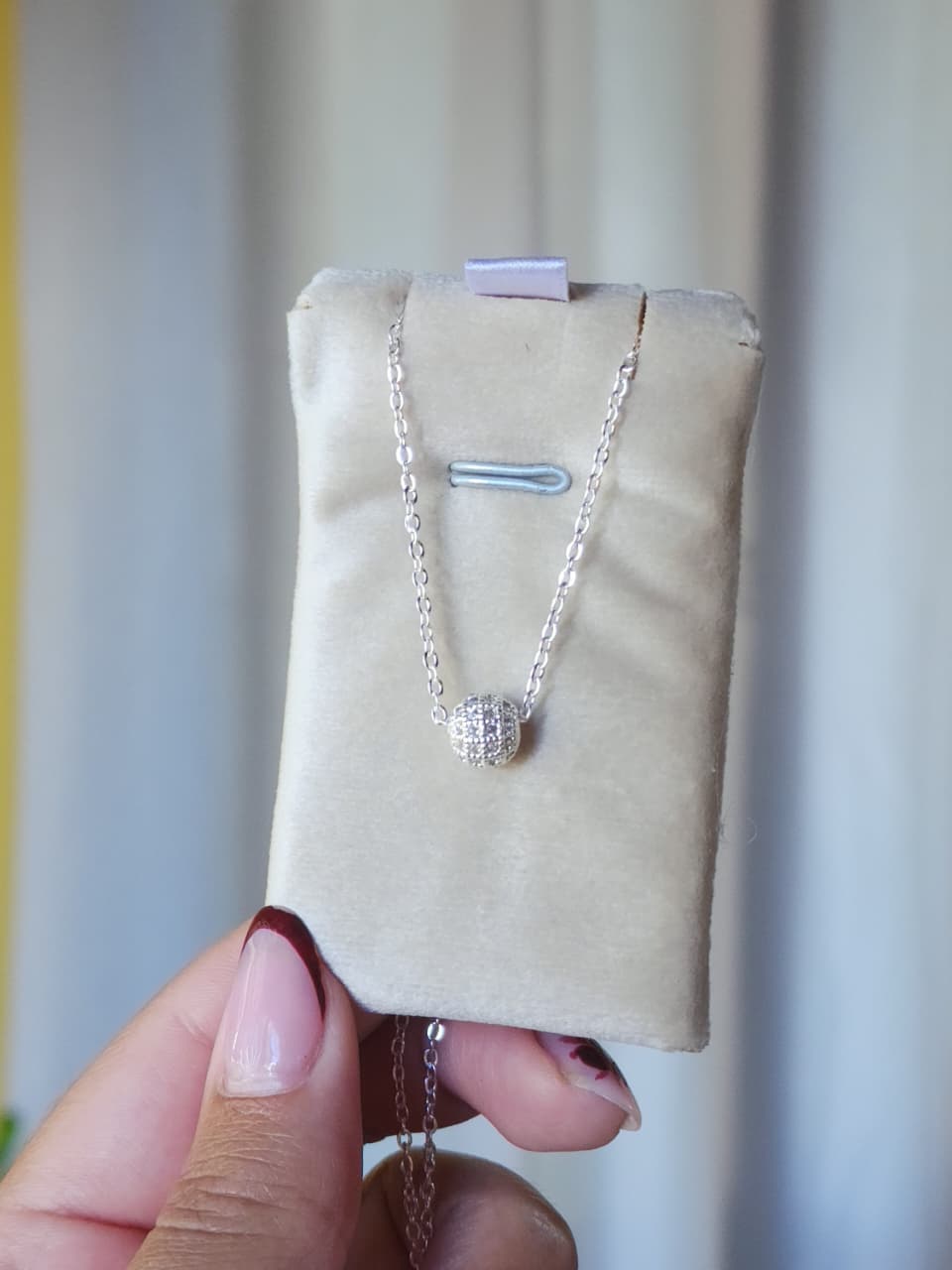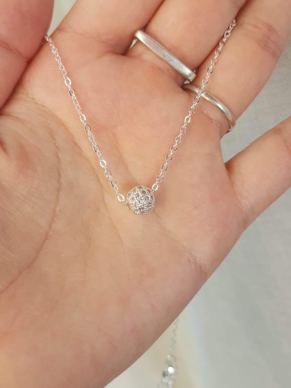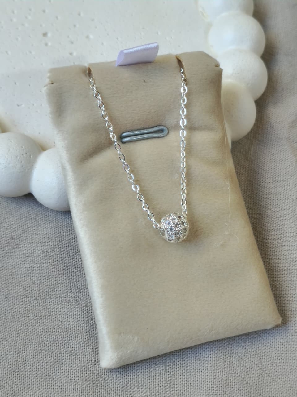 Cadena acero blanco, cadena espejito con dije esfera y micro-cristales..