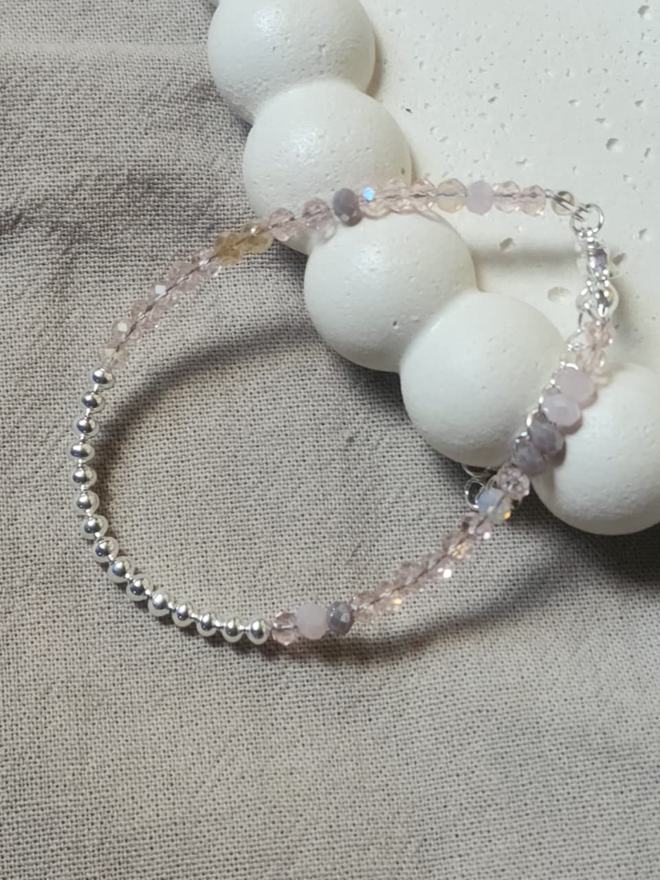 Pulsera acero blanco, con cristales tonos violetas y bolitas.