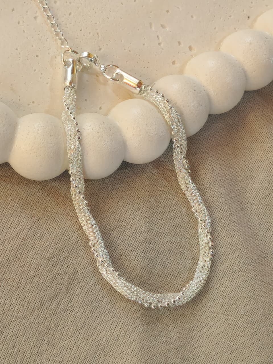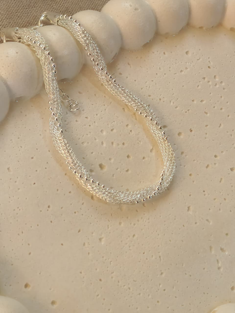 Pulsera acero blanco, doble cadena, canasta y bolitas continuas.